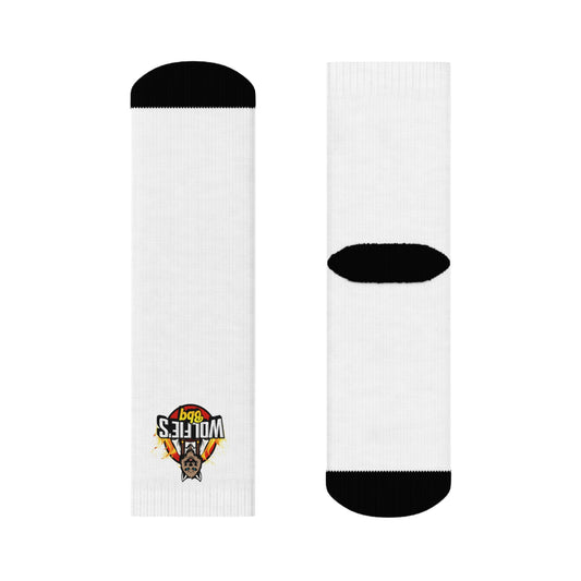 White Crew Socks with Small Sports Logo — Retro Team Emblem Sock